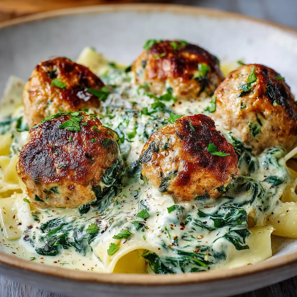 Découvrez ces délicieuses boulettes de poulet à la ricotta, accompagnées de pâtes et d’une sauce crémeuse aux épinards.