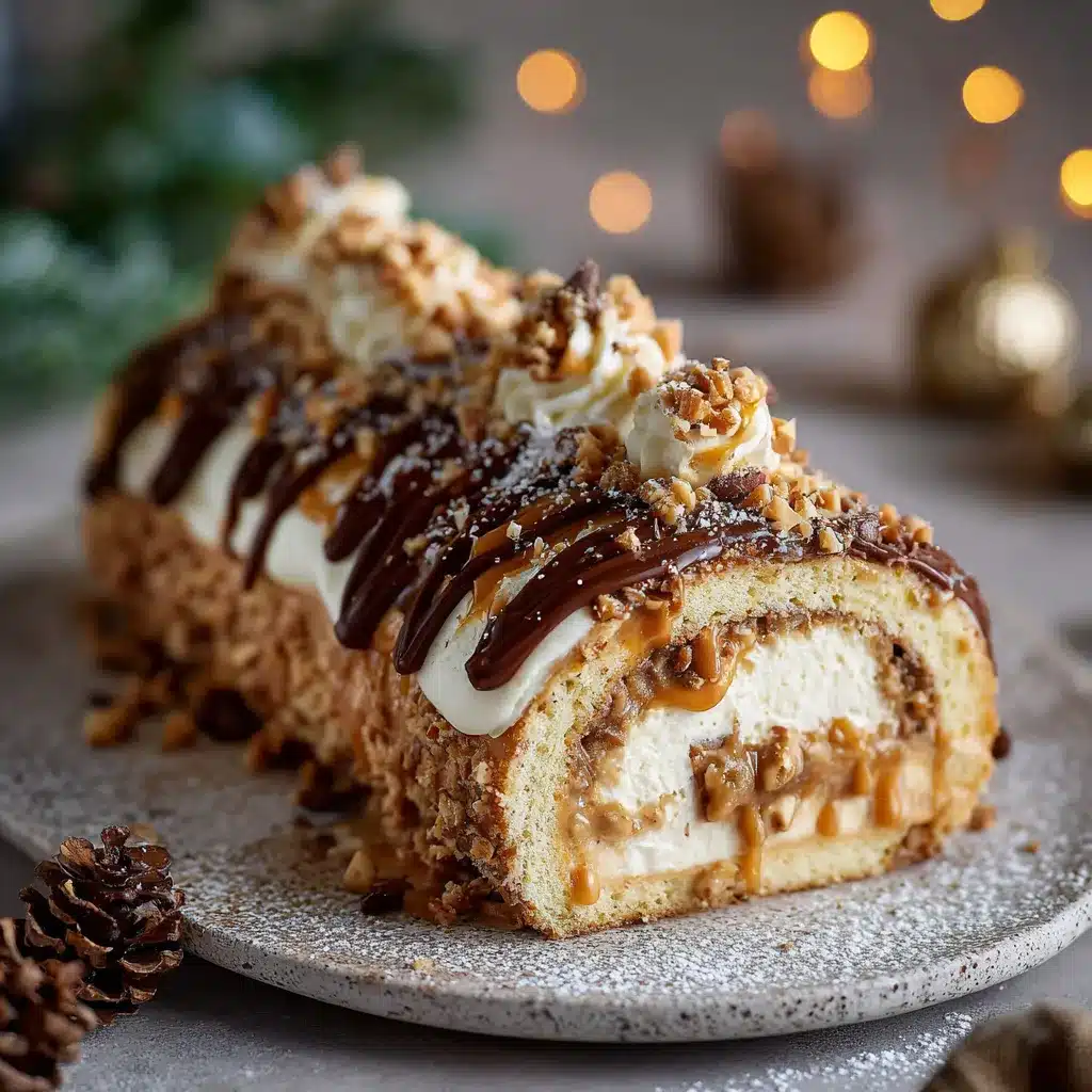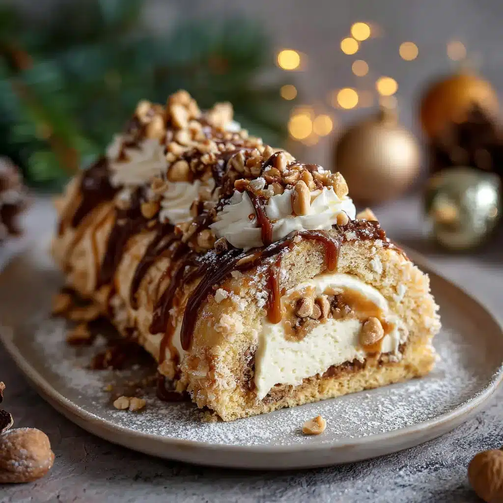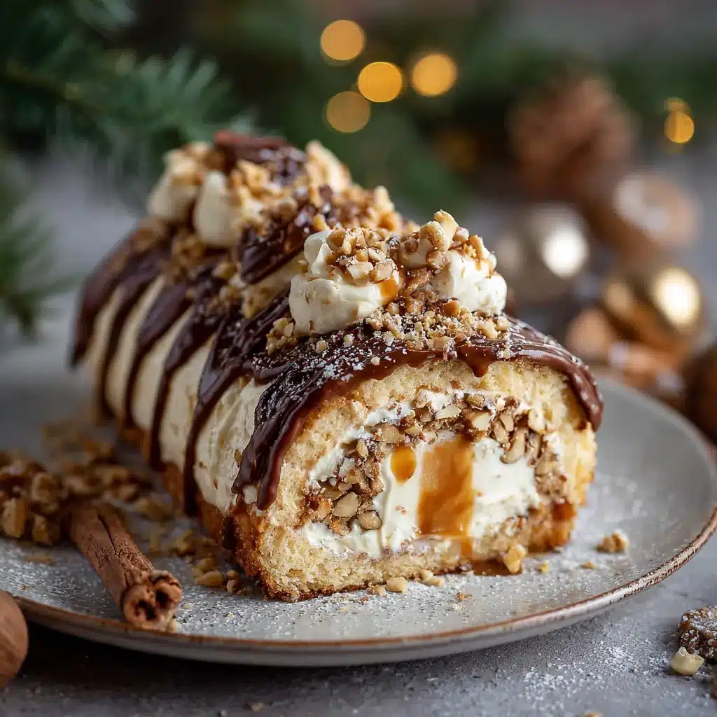 Cette délicieuse bûche de Noël allie le goût savoureux des cacahuètes, la douceur du caramel et l’arôme de la vanille, un dessert parfait pour les fêtes.