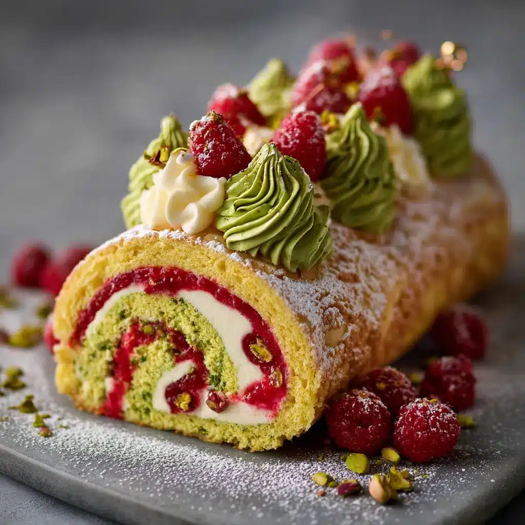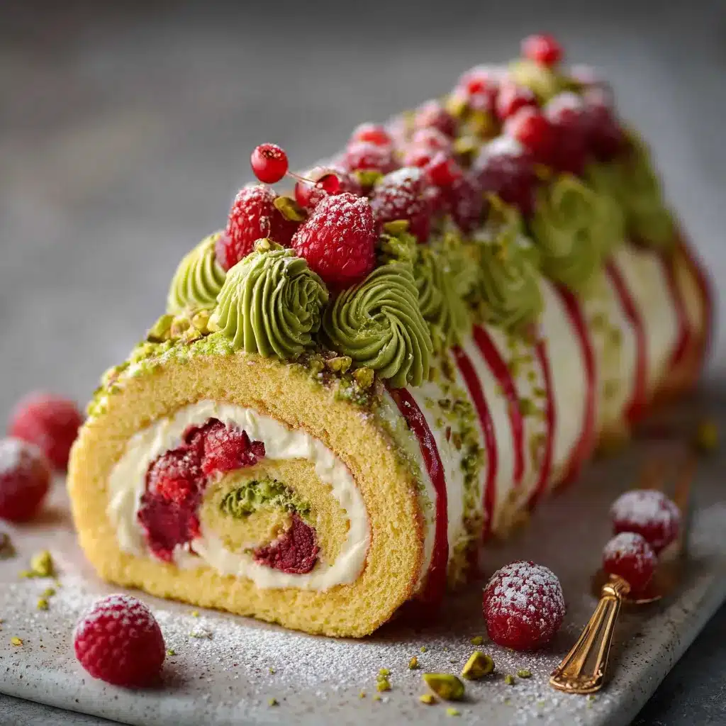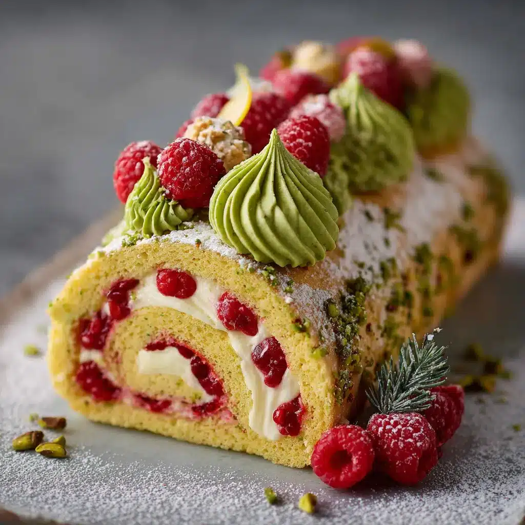 Une délicieuse bûche de Noël alliant la douceur de la framboise à la richesse de la pistache, parfaite pour les fêtes.