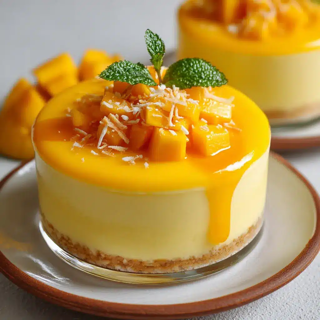 - Fruits frais : Ajoutez des morceaux de mangue et d’orange sur le dessus pour rehausser le goût et la couleur. Les fruits complètent parfaitement le crémeux de votre dessert.