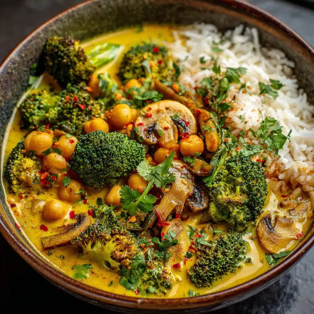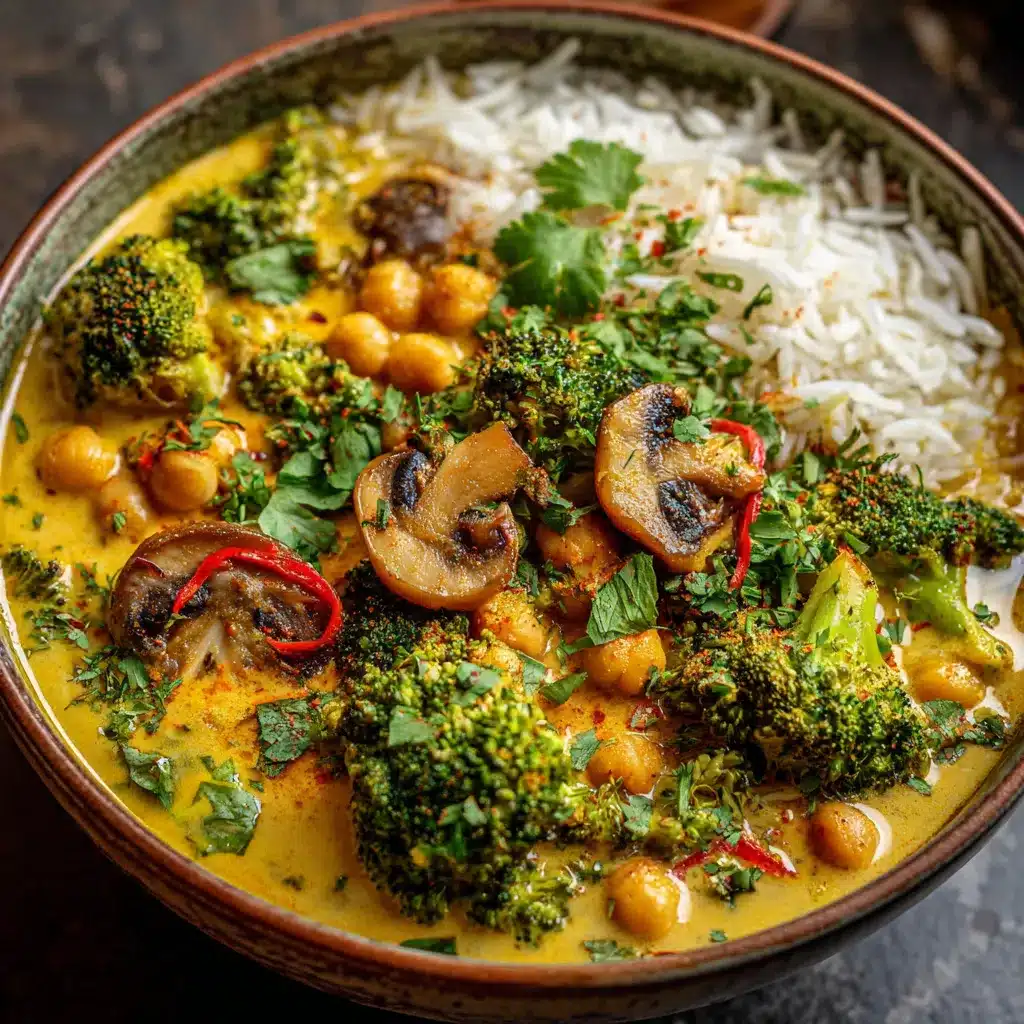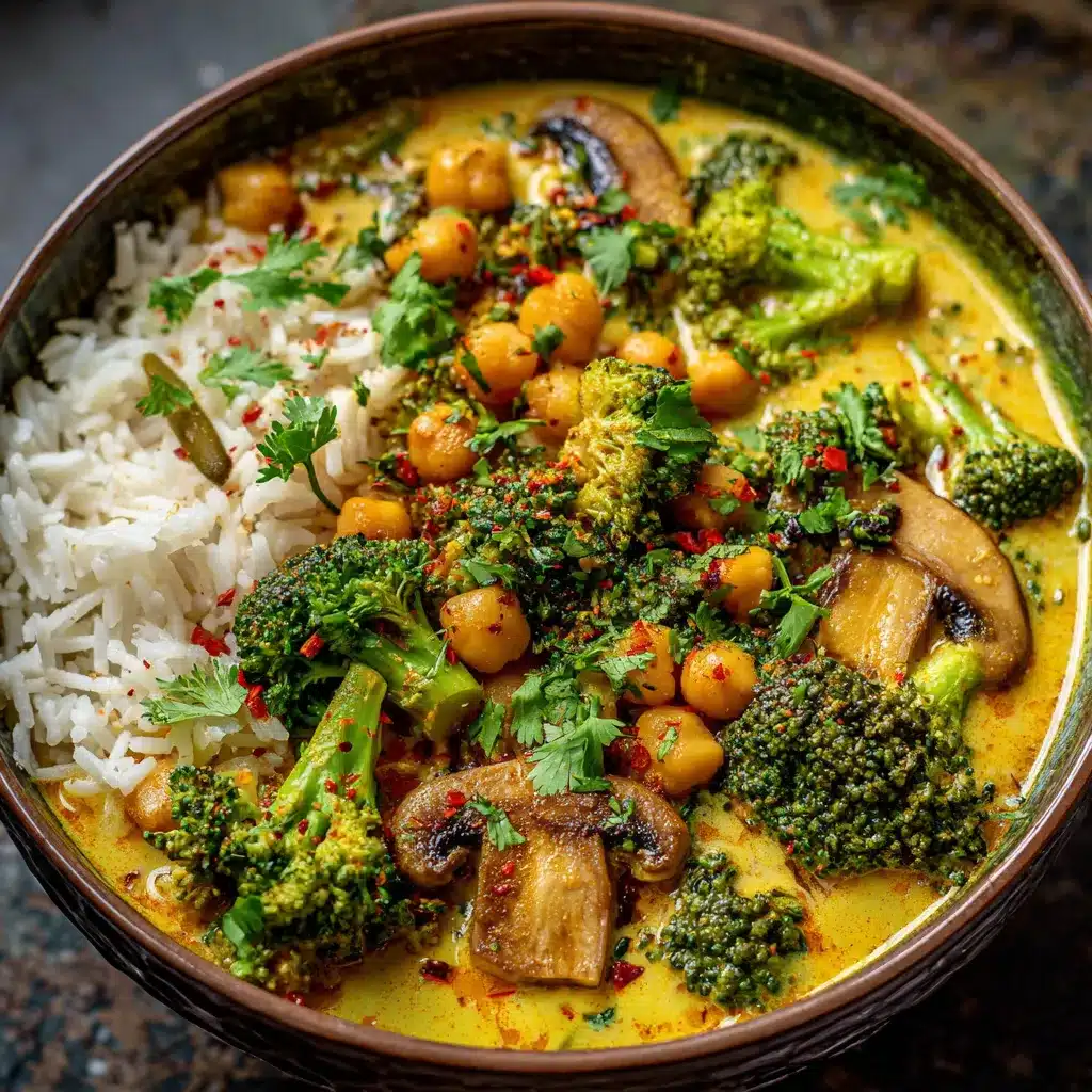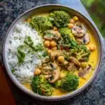 Découvrez ce délicieux curry crémeux au lait de coco avec du brocoli, des pois chiches et des champignons, parfait pour un repas réconfortant.