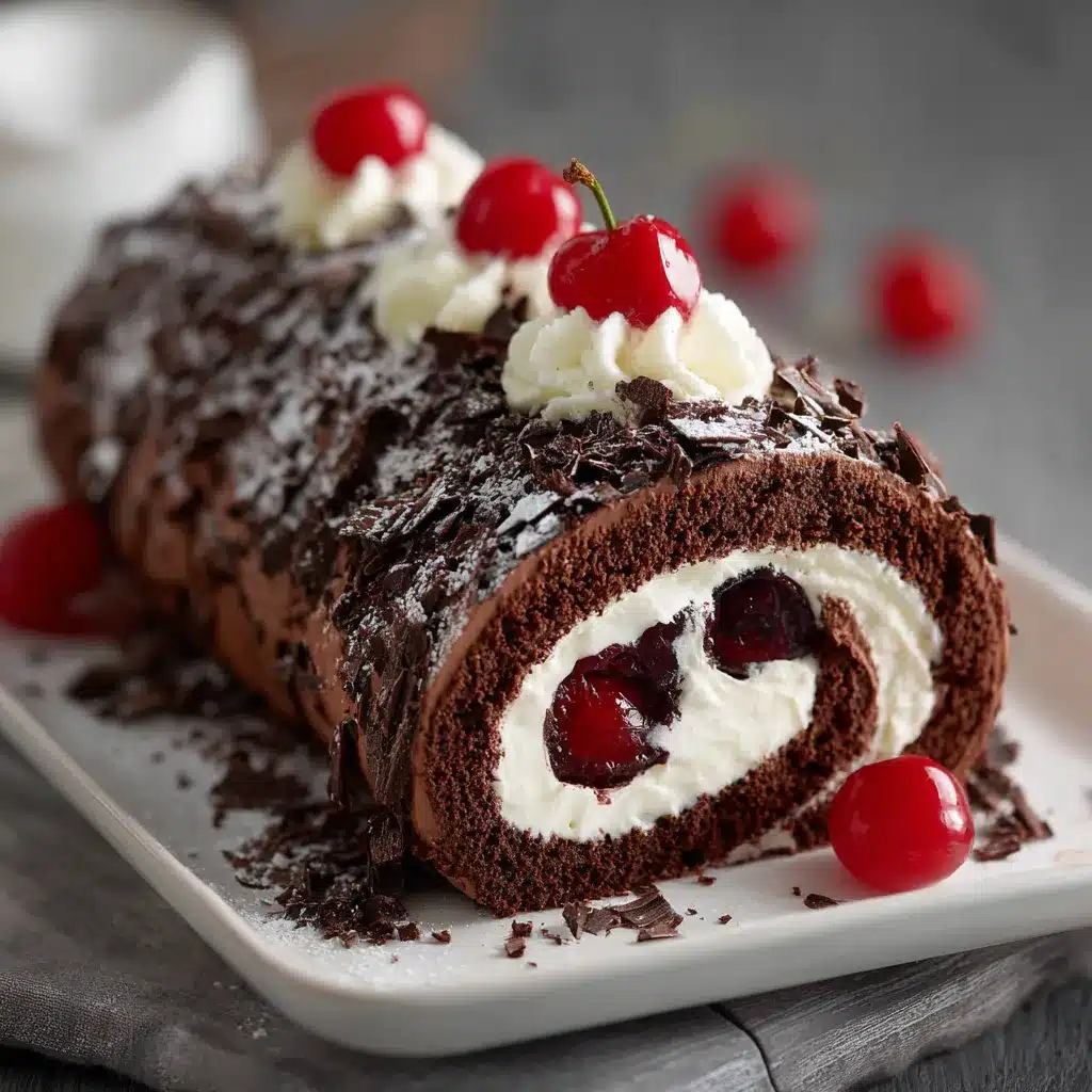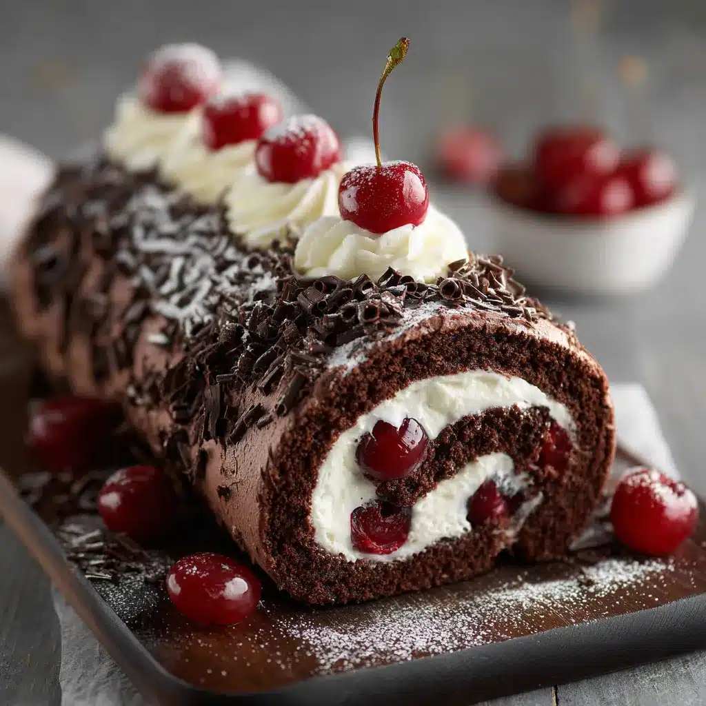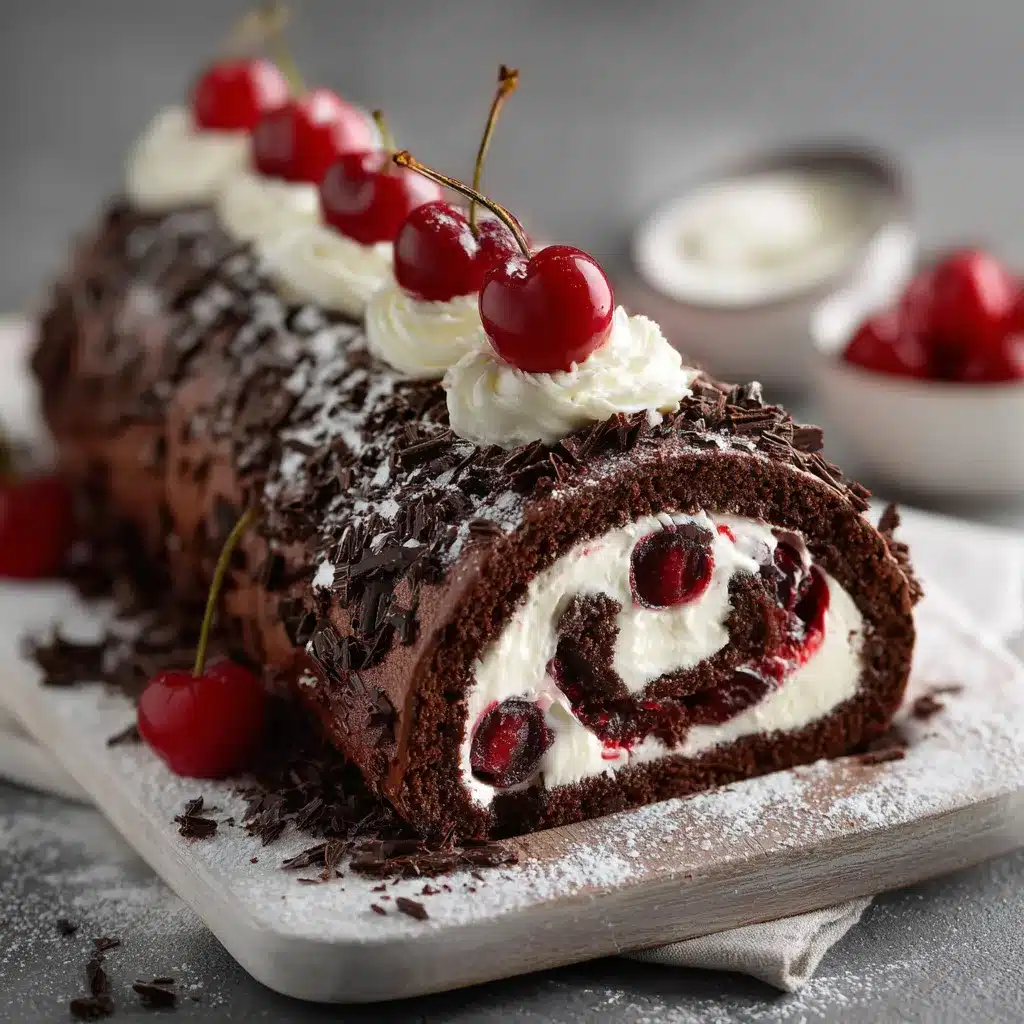 Découvrez ce délicieux gâteau roulé inspiré de la Forêt-Noire, parfait pour les occasions spéciales ou un dessert à partager.