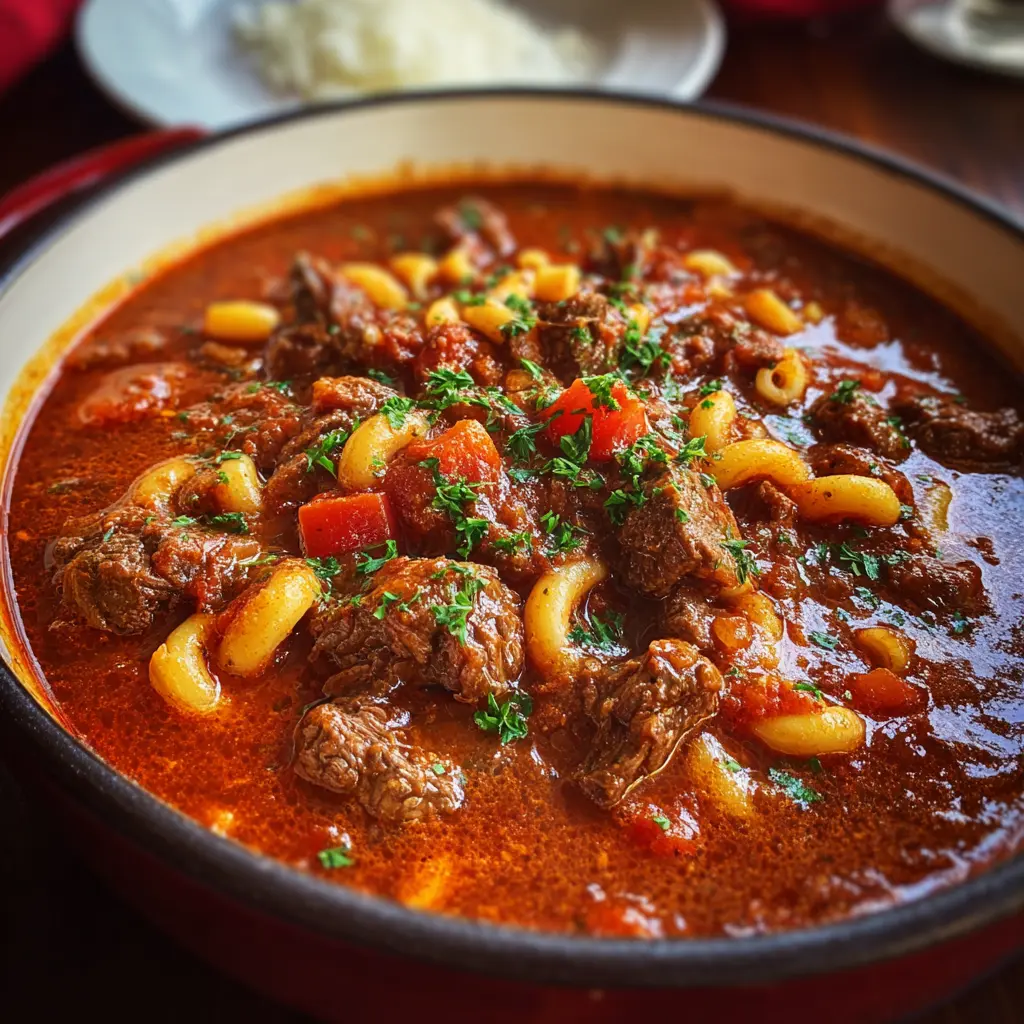 Riche en saveurs : Chaque bouchée de goulash est une explosion de goûts réconfortants. Les tomates juteuses, la viande savoureuse et les épices comme le paprika créent un équilibre parfait qui réchauffe le cœur.