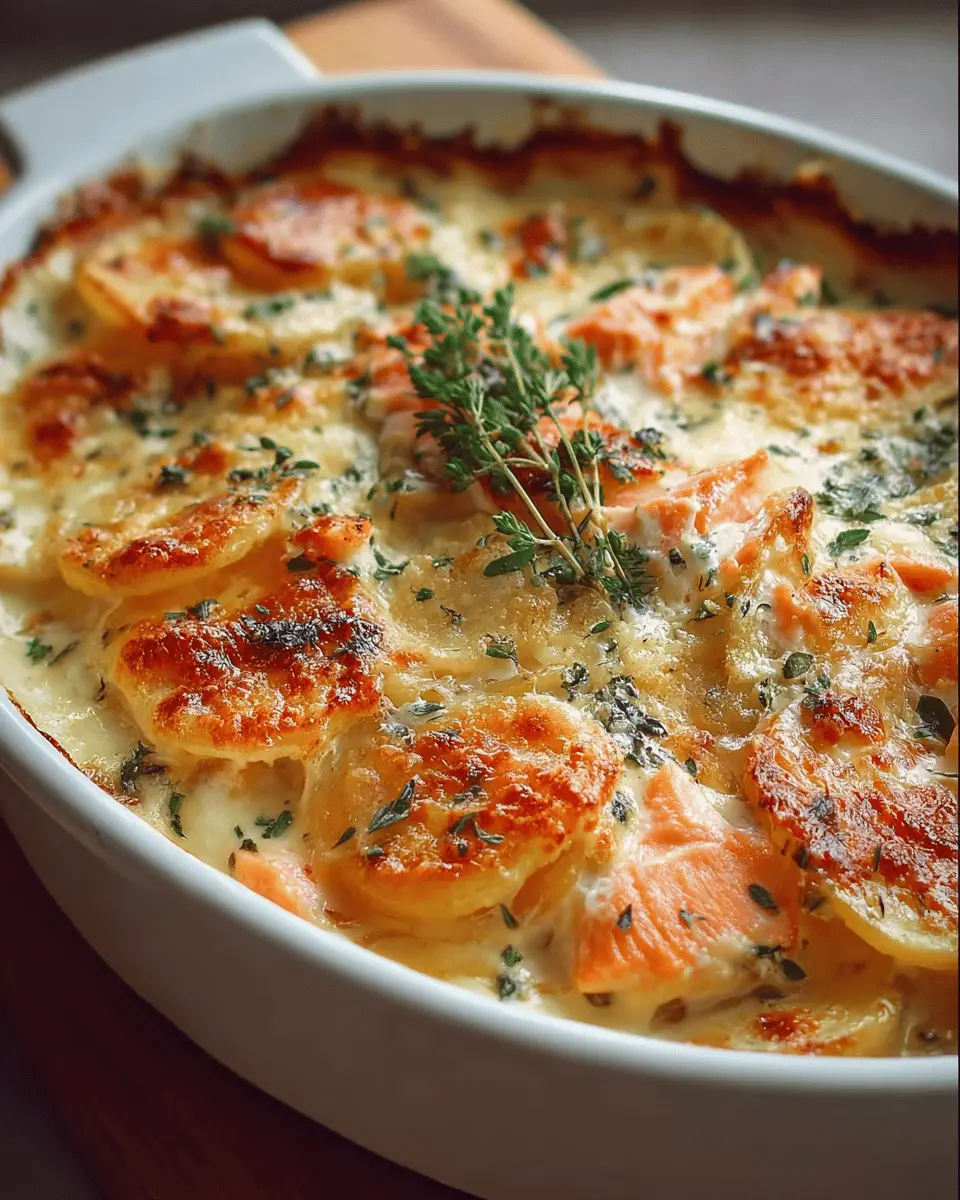 Gratin de pommes de terre au saumon et à la sauce béchamel indulgent