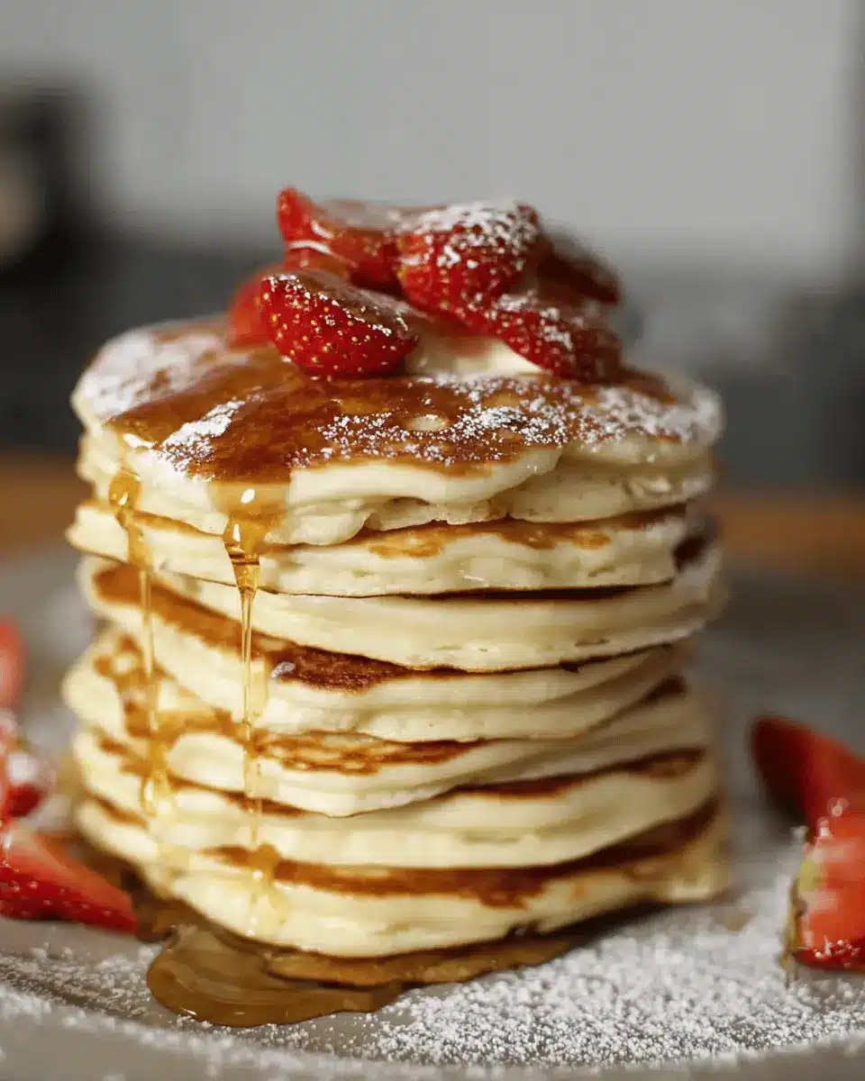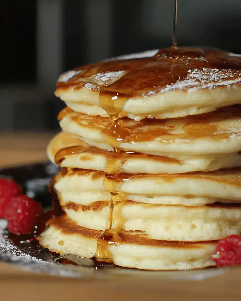 Superposez plusieurs pancakes sur une assiette et saupoudrez-les de sucre glace. Cela crée un bel effet de hauteur et attire immédiatement l’œil. Vous pouvez ajouter un peu de sirop d’érable sur le dessus qui s’écoulera doucement sur les bords.