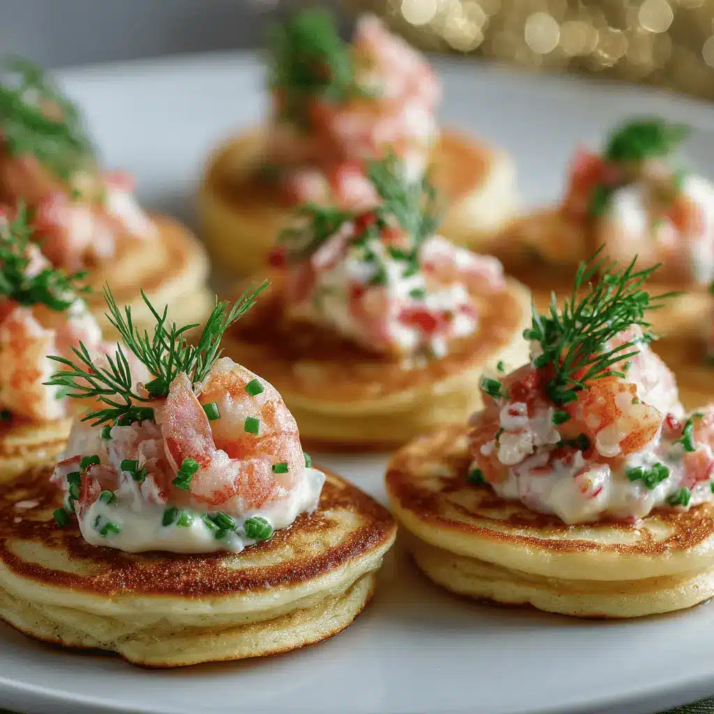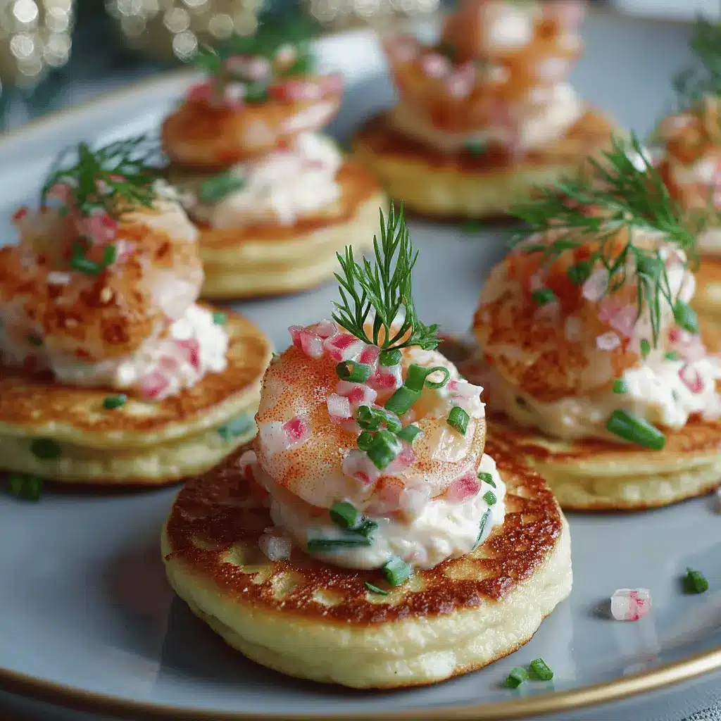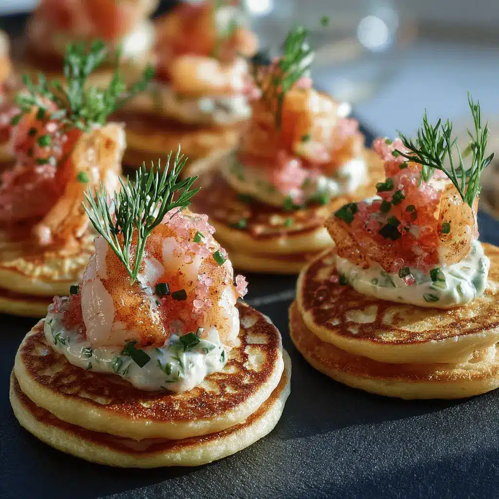 Des mini blinis moelleux garnis de crevettes roses et accompagnés d’une mayonnaise légère à l’aneth, parfaits pour un apéritif.