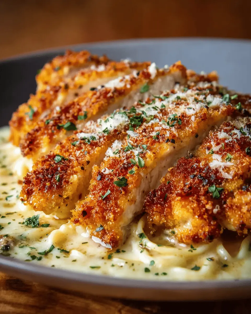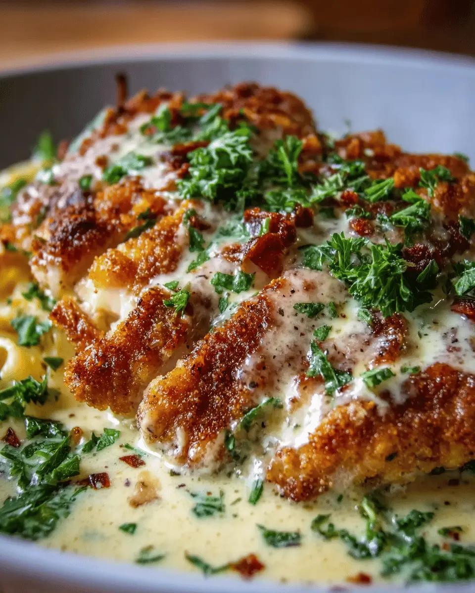 Découvrez cette recette de poulet croustillant accompagné d’une délicieuse sauce parmesan crémeuse, parfaite pour un repas savoureux.
