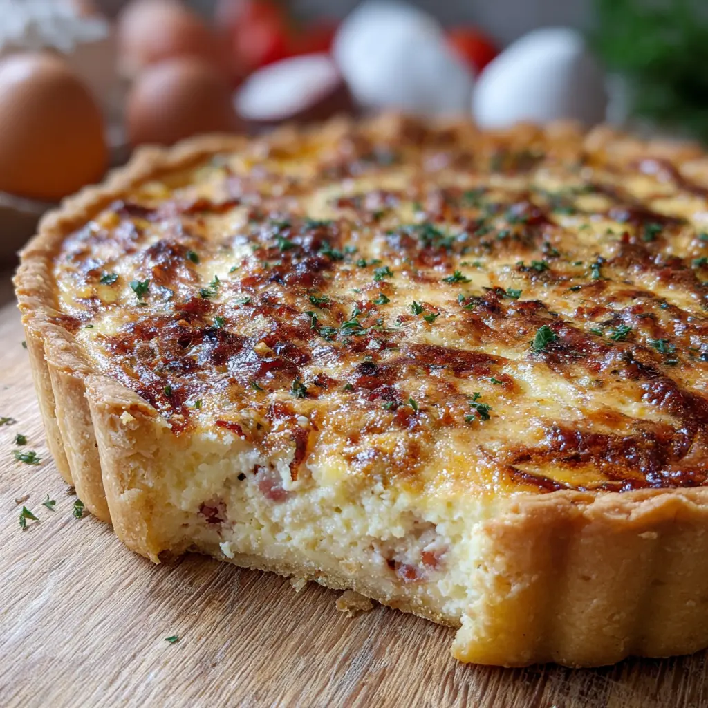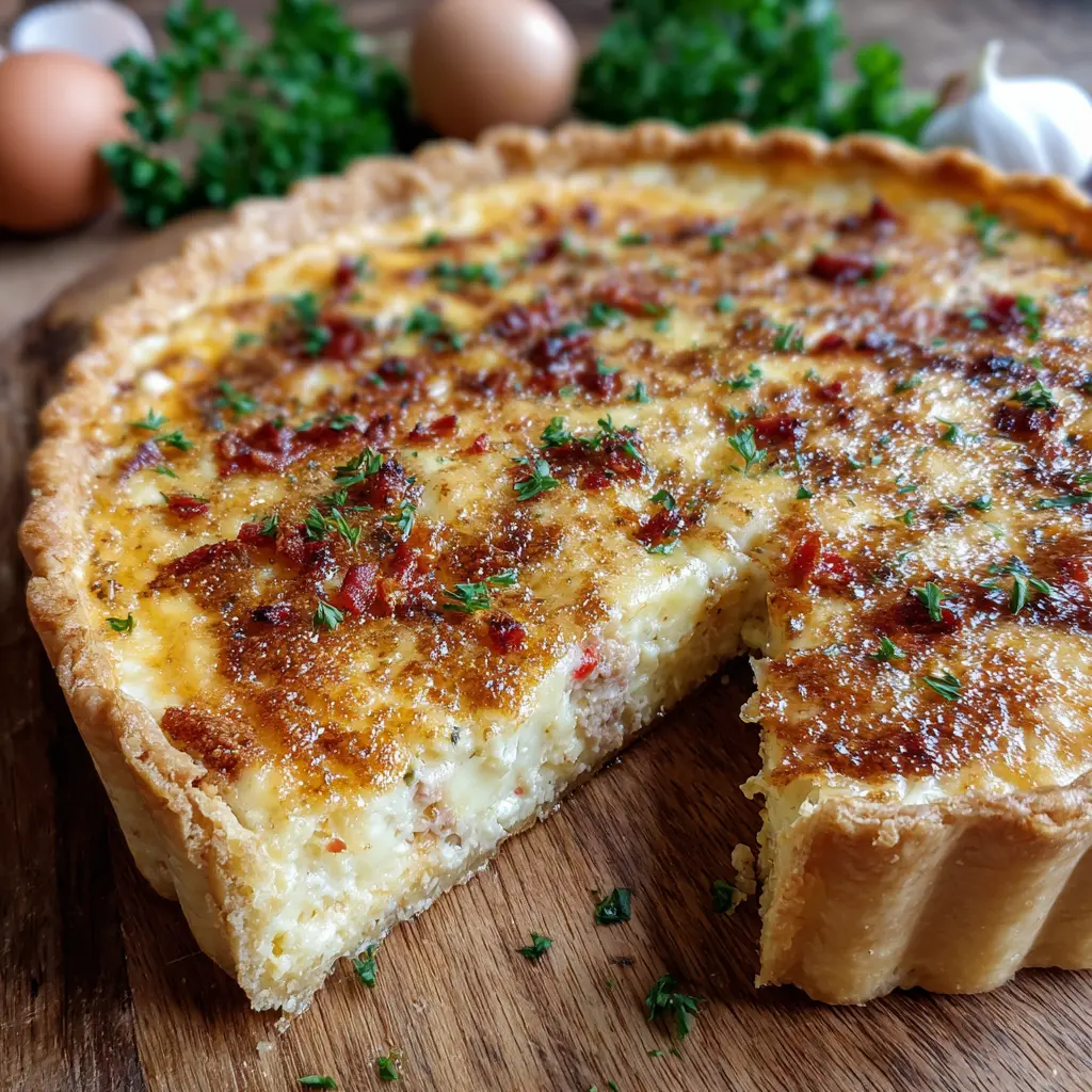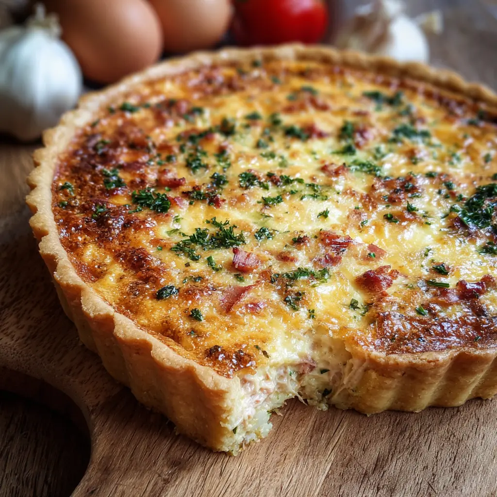 Découvrez cette délicieuse quiche au thon, agrémentée de jambon de poulet et de bacon de dinde, parfaite pour un repas léger ou un pique-nique.