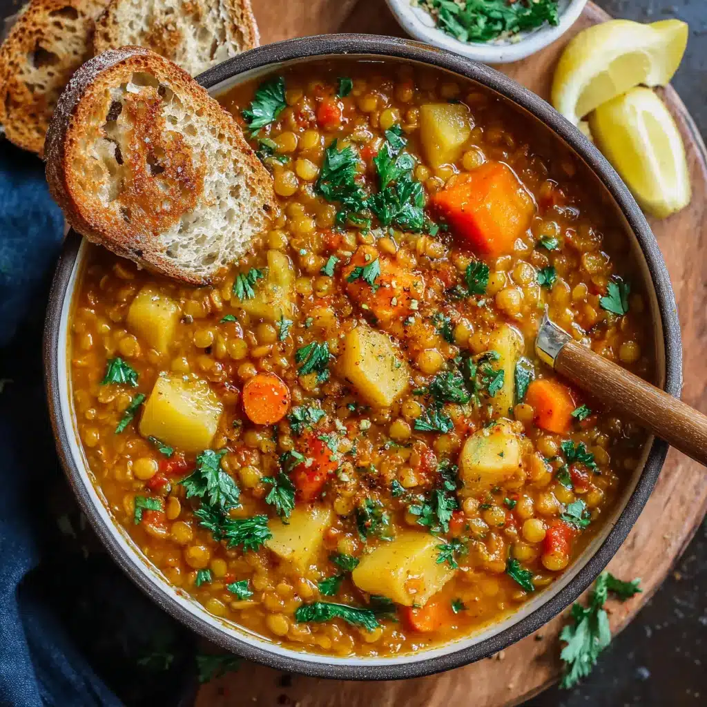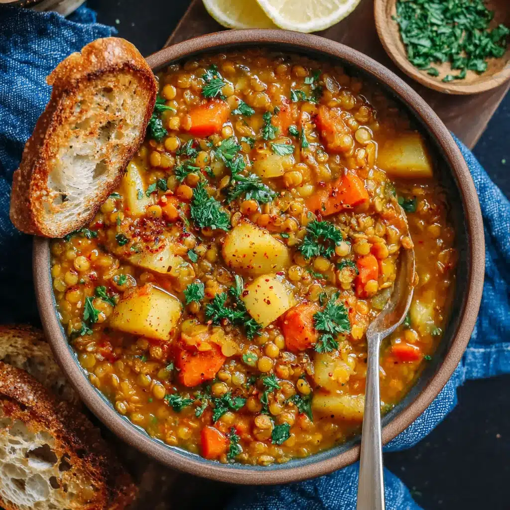Un délicieux ragoût de lentilles agrémenté de carottes et de pommes de terre, le tout servi avec du pain grillé pour un repas réconfortant.