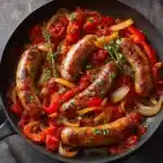 Le piment apportera une belle chaleur au plat, équilibrant parfaitement la richesse des saucisses. Si vous aimez les plats épicés, n’hésitez pas à en ajouter un peu plus ou à utiliser différents types de piments. Je vous conseille d’utiliser des piments d’Espelette pour une touche authentique.