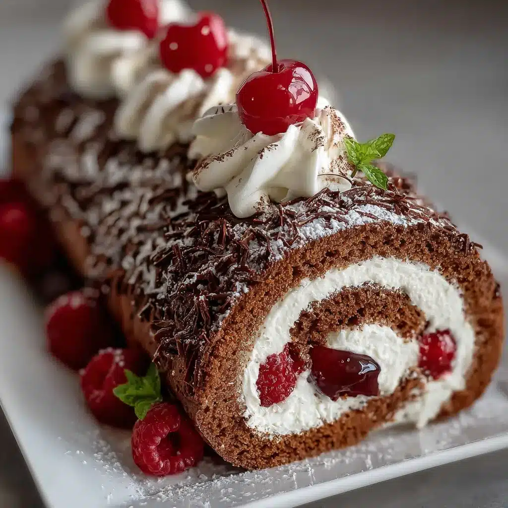 Pour sublimer votre roulé suisse de la Forêt-Noire allemande, pensez à une présentation soignée. Disposez délicatement des tranches sur une assiette en ardoise ou en bois. Ajoutez un petit coulis de chocolat sur le côté pour une touche d’élégance et une explosion de saveurs. Quelques feuilles de menthe ou des baies fraîches comme des framboises ou des myrtilles apporteront une belle touche de couleur et de fraîcheur. Le contraste entre le chocolat foncé du roulé et les teintes vives des fruits rendra ce dessert irrésistible.