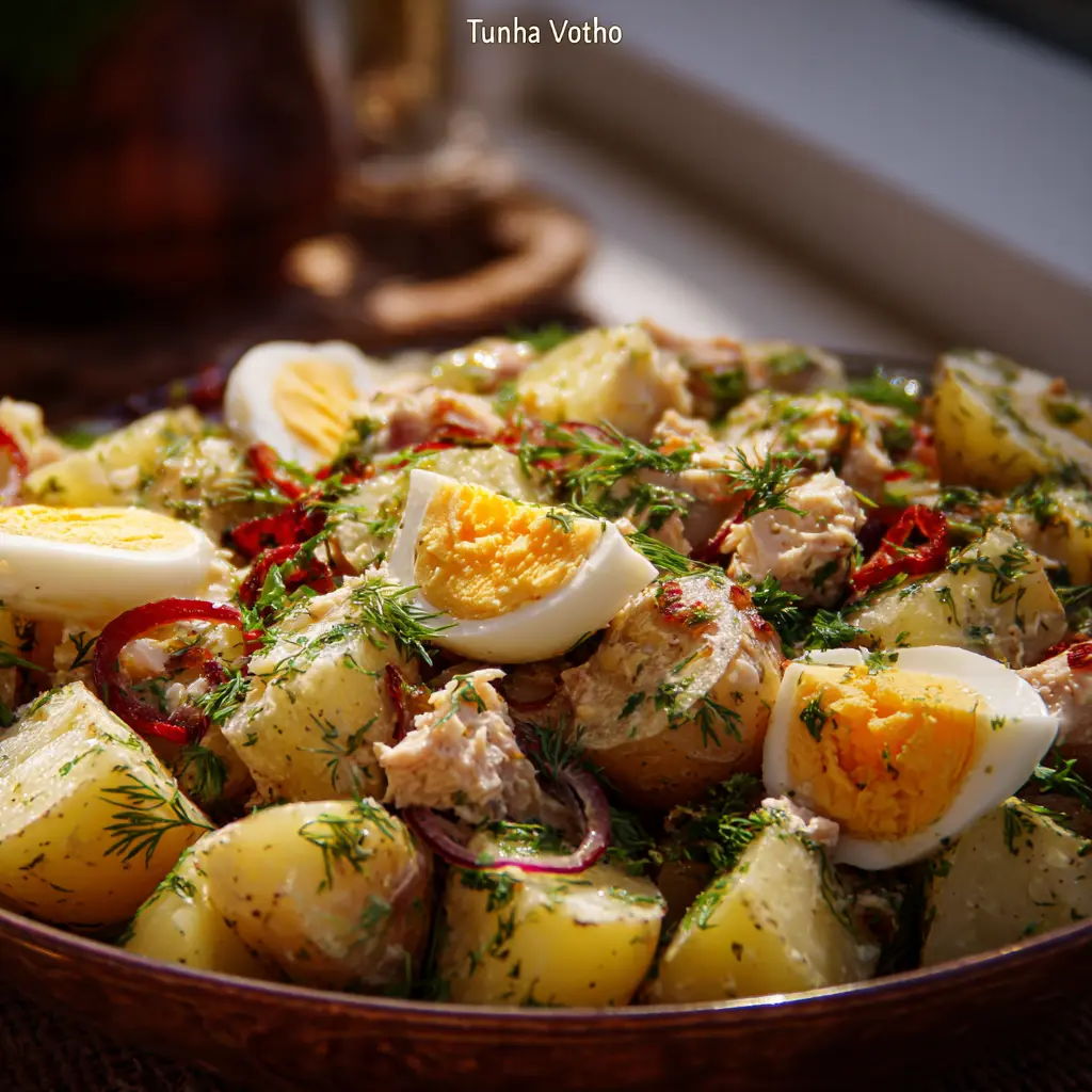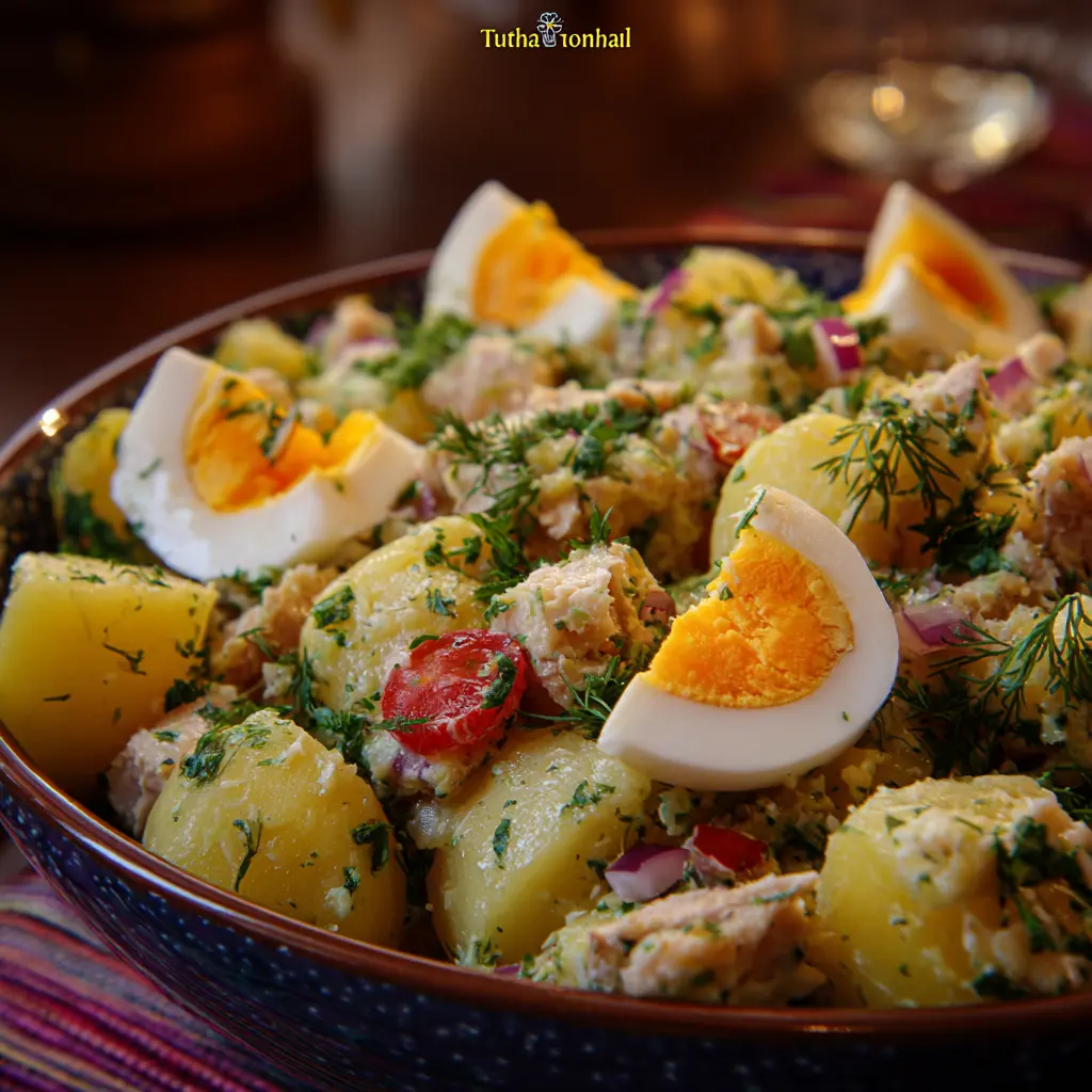 Découvrez une délicieuse salade de pommes de terre au thon et aux œufs frais, parfaite pour un repas léger et raffiné.