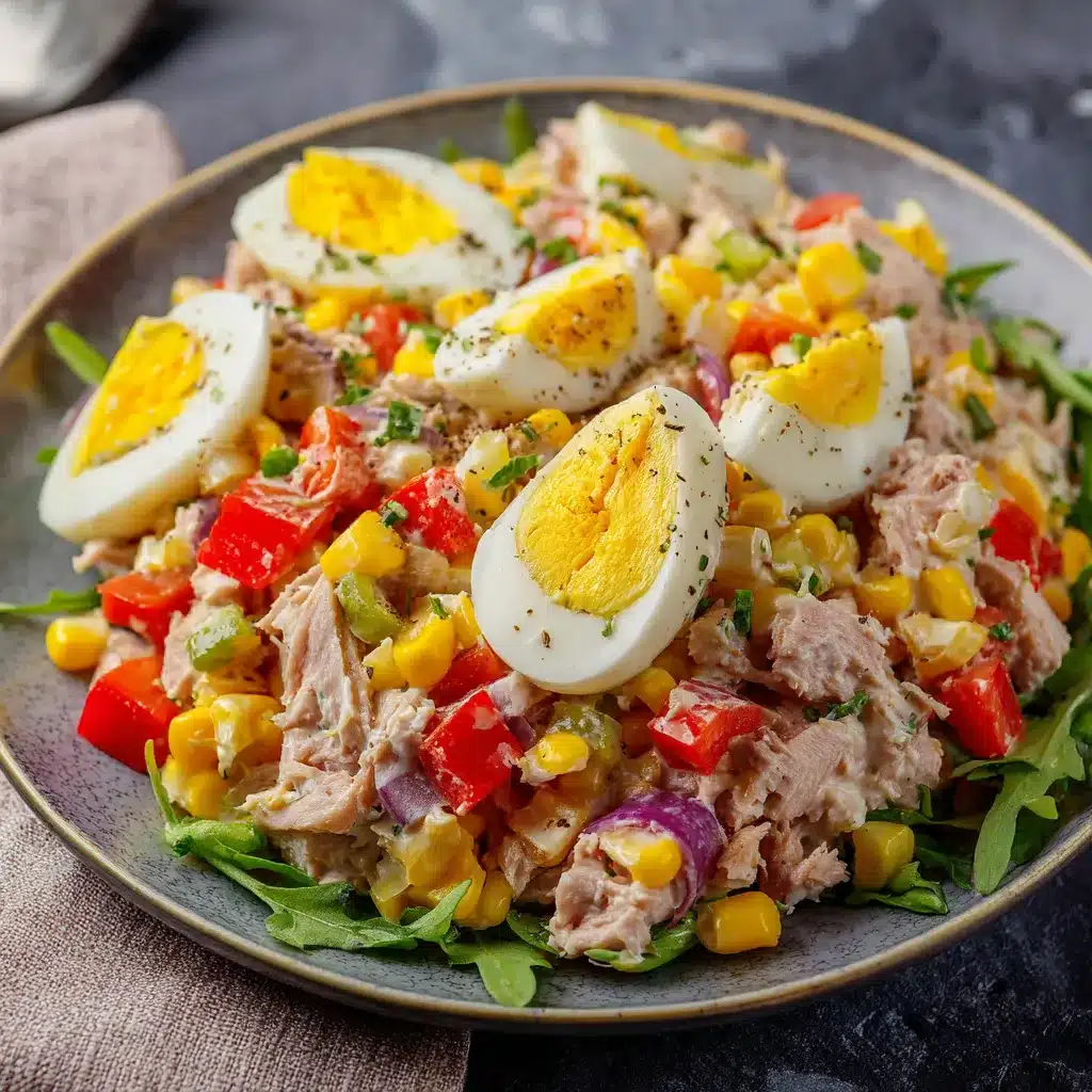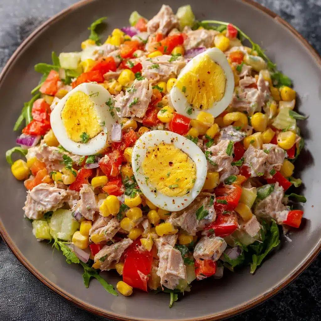 Et voilà ! Vous êtes prêt à savourer votre salade de thon, poivron, maïs et œuf. C’est rapide, nutritif, et parfait pour un déjeuner ou un dîner léger. Pensez à l’accompagner d’un bon pain pour un repas complet. Bon appétit !