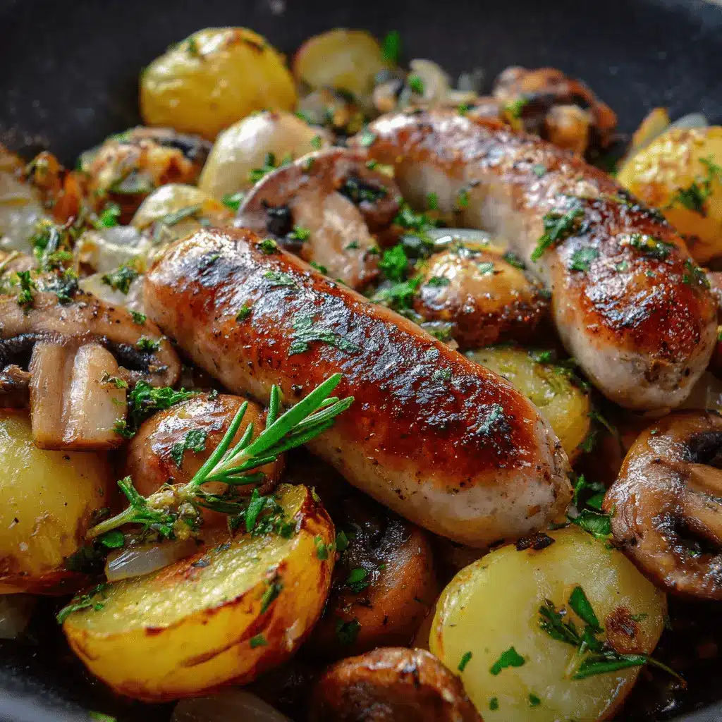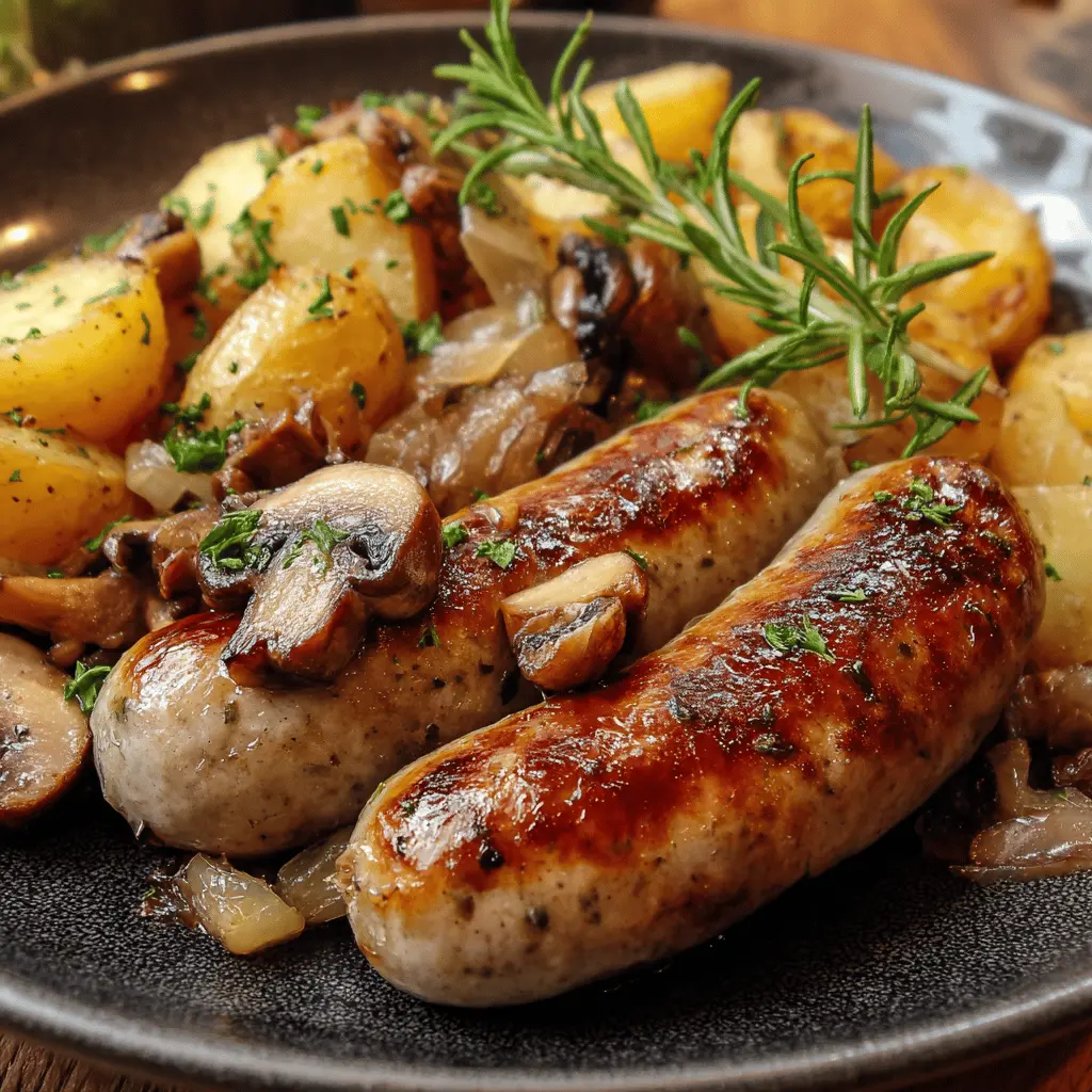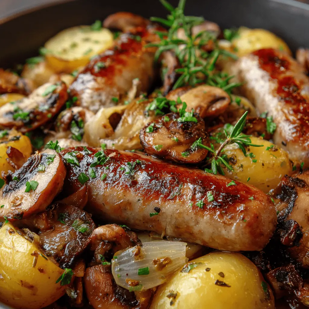 Un plat réconfortant de saucisses de bœuf accompagné de champignons et de pommes de terre rôties, parfait pour un dîner en famille.