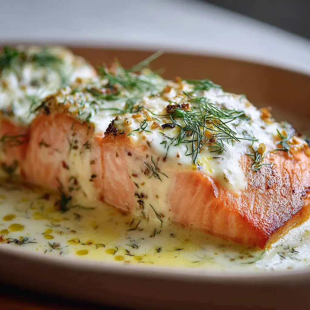 - Placez le saumon dans un plat allant au four et versez le mélange de crème sur le saumon.