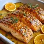 Découvrez comment préparer un saumon délicieux au four, nappé d’un glaçage sucré de miel et de moutarde, avec une touche d’orange.