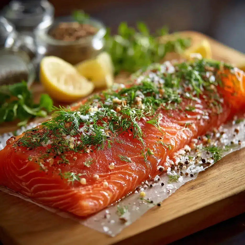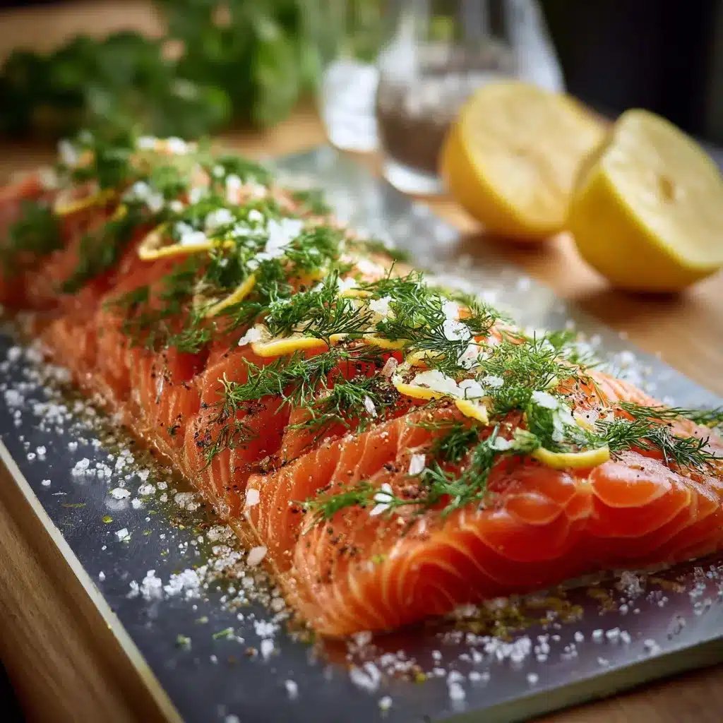 Préparez un délicieux saumon gravlax maison avec de l’aneth frais et des zestes de citron pour une touche de fraîcheur.