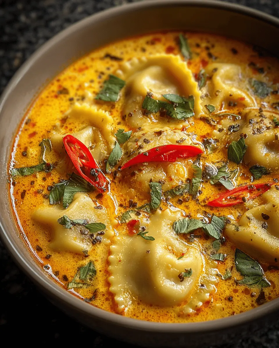 Enfin, présentez votre chef-d’œuvre dans de jolis bols. Décorez avec quelques feuilles de coriandre fraîche et, si le cœur vous en dit, un peu de piment frais pour un coup de fouet supplémentaire. Cette soupe thaïlandaise aux raviolis au curry et lait de coco est parfaite pour les soirées fraîches ou pour toute occasion qui mérite un plat savoureux et réconfortant.