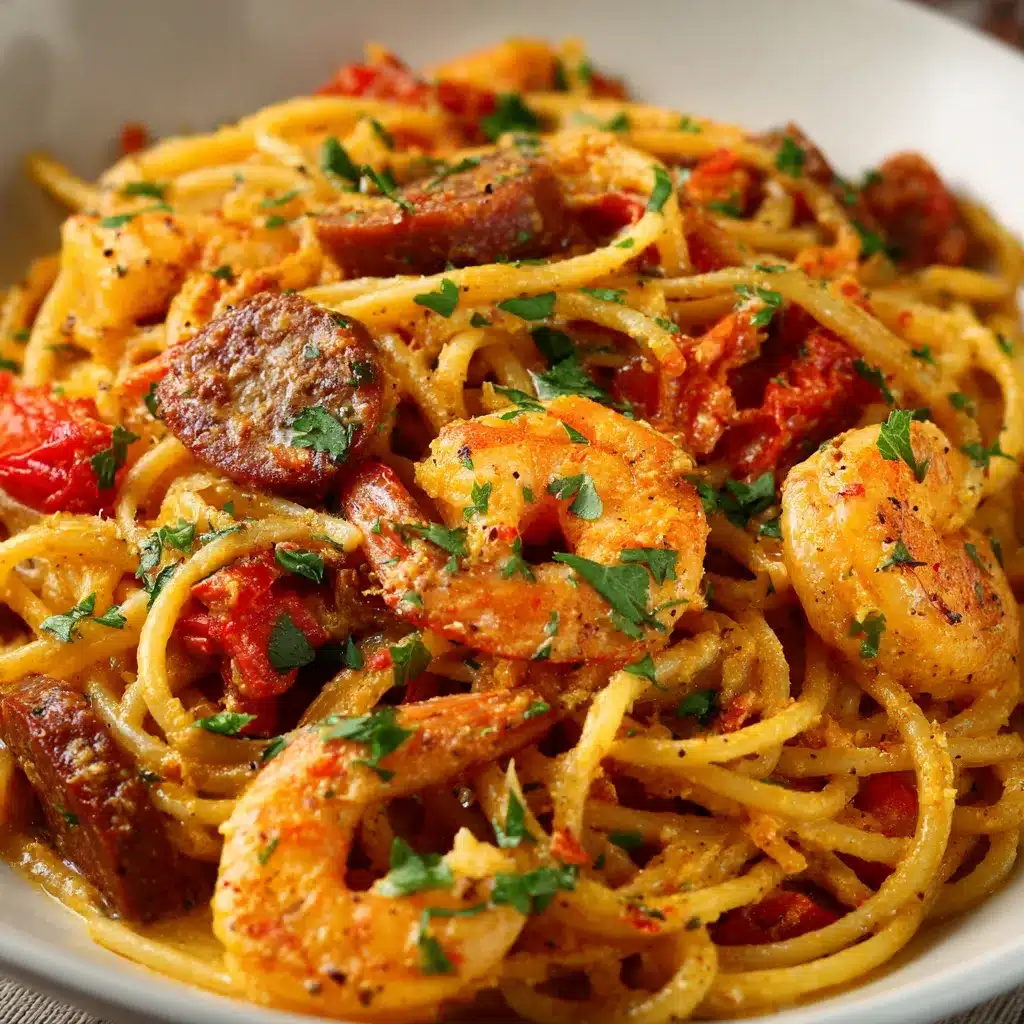 Un plat de pâtes savoureux et coloré, associant une sauce onctueuse aux poivrons grillés, du chorizo croustillant, du bœuf haché et des crevettes juteuses. Parfait pour un dîner méditerranéen simple et impressionnant.