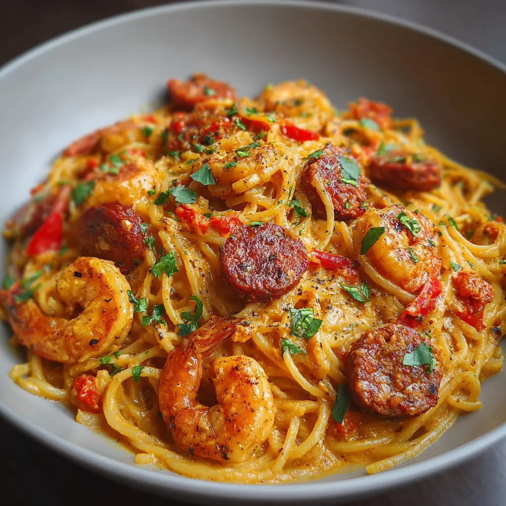 Une recette délicieuse de spaghetti crémeux enrichie de poivrons, chorizo et crevettes, parfaite pour un repas en famille ou entre amis.