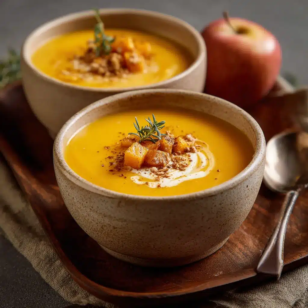 Velouté pomme potimarron crémeux à la muscade et au bacon de dinde